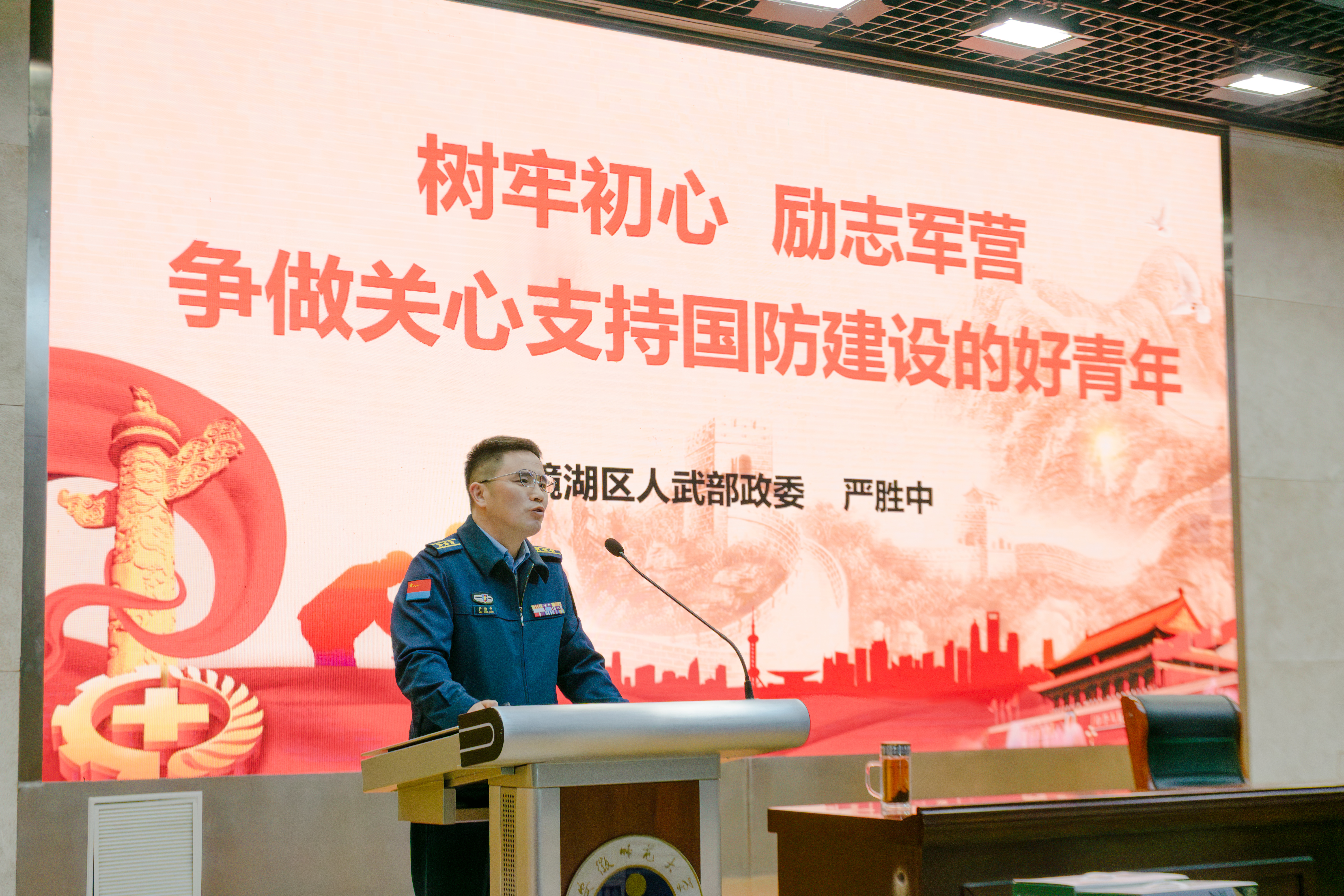 严胜中政委作题为《树牢初心 励志军营 争做关心支持国防建设的好青年》的宣讲,围绕“我军的发展历程”“近年来军队建设成就”以及“应征入伍的‘六笔账’”三个方面展开国防教育和政策解读,鼓励毕业生踊跃参军,在国防一线挥洒青春。