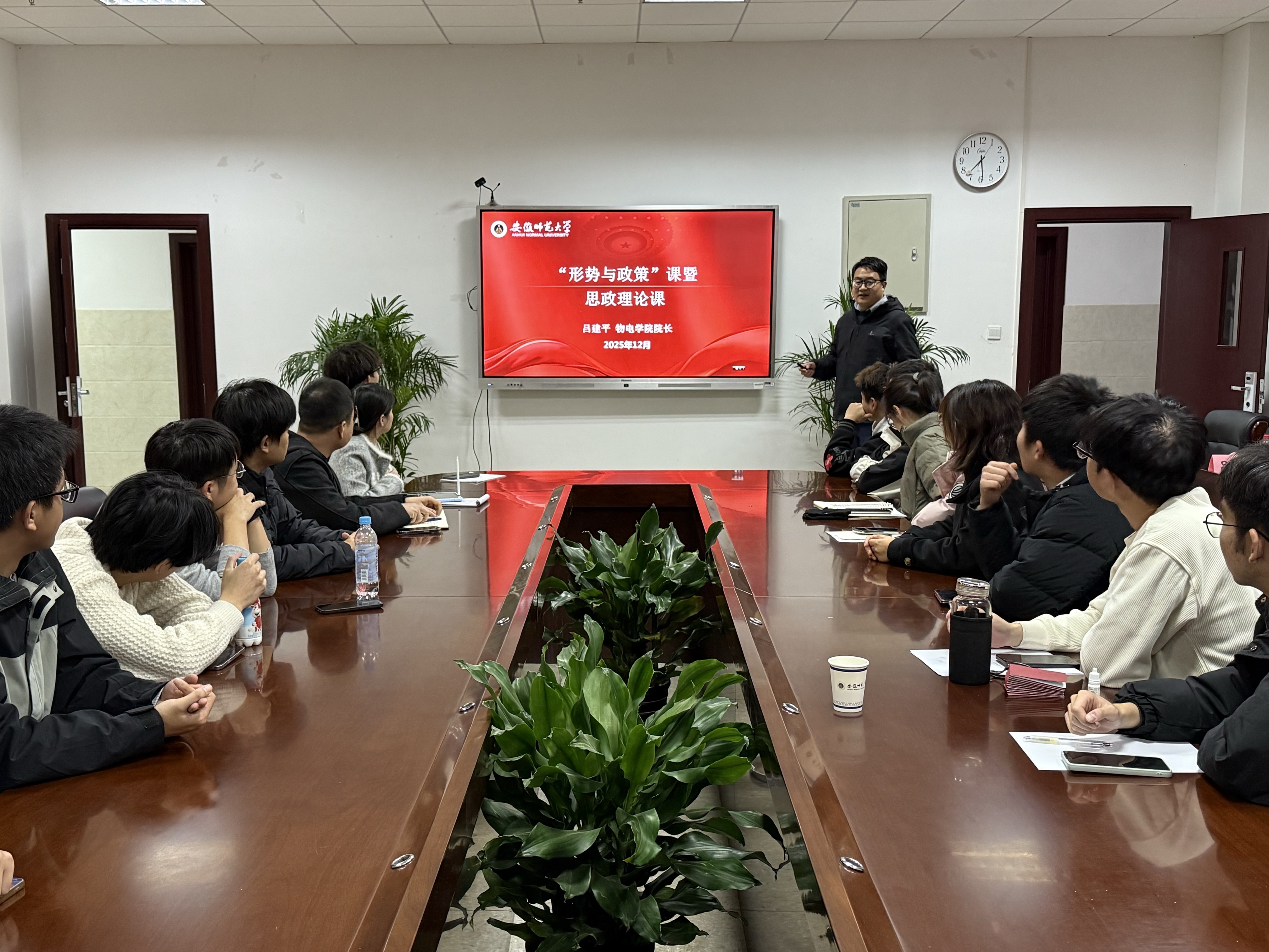 12月2日晚,物电学院党委副书记、院长吕建平在物理楼308会议室为学院研究生第四党支部讲授“形势与政策”课暨思想理论课,带领学生党员集中学习党的二十届四中全会精神。课程由支部书记朱骞主持,支部全体党员参加会议。