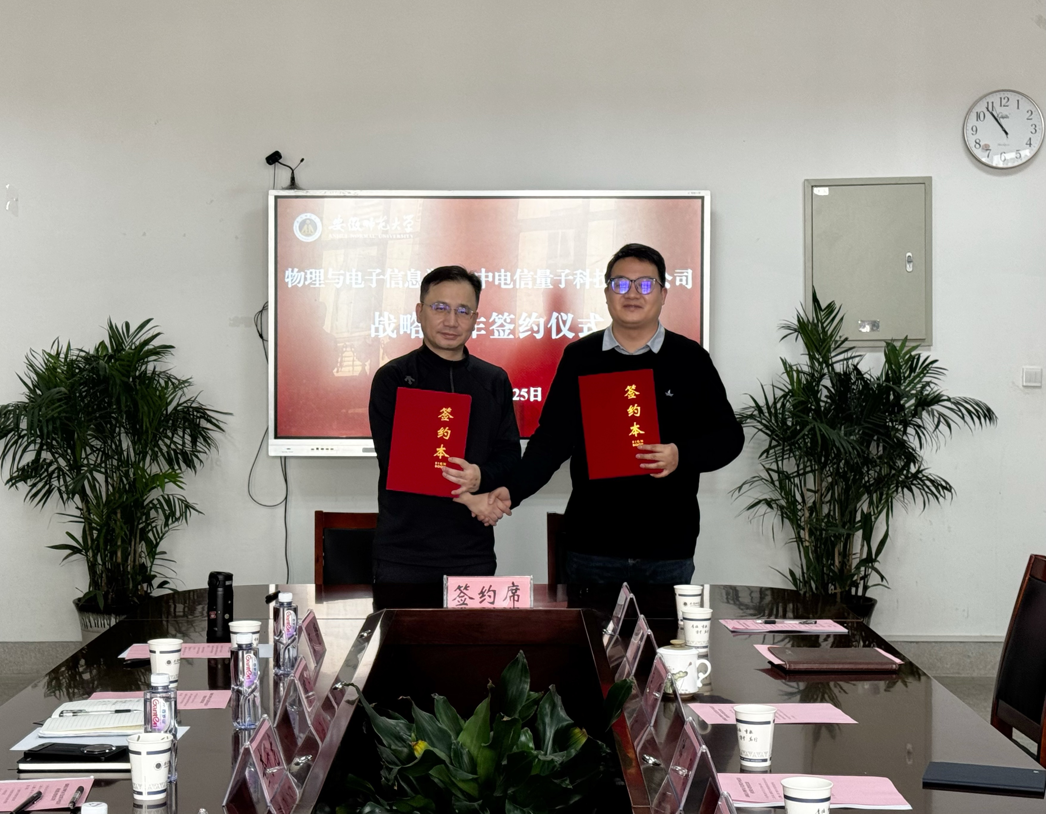 12月25日上午,物理与电子信息学院与中电信量子科技有限公司举行战略合作签约仪式。中电信量子科技有限公司总经理查子龙、量子计算和精密测量事业部教育行业总监朱鹏飞,中国电信股份有限公司芜湖分公司副总经理陈佳、教育行业客户部总经理蒋立君、本科总监杨静,校团委书记陈骁、以及物电学院领导老师共同出席签约仪式。仪式由吕建平主持。