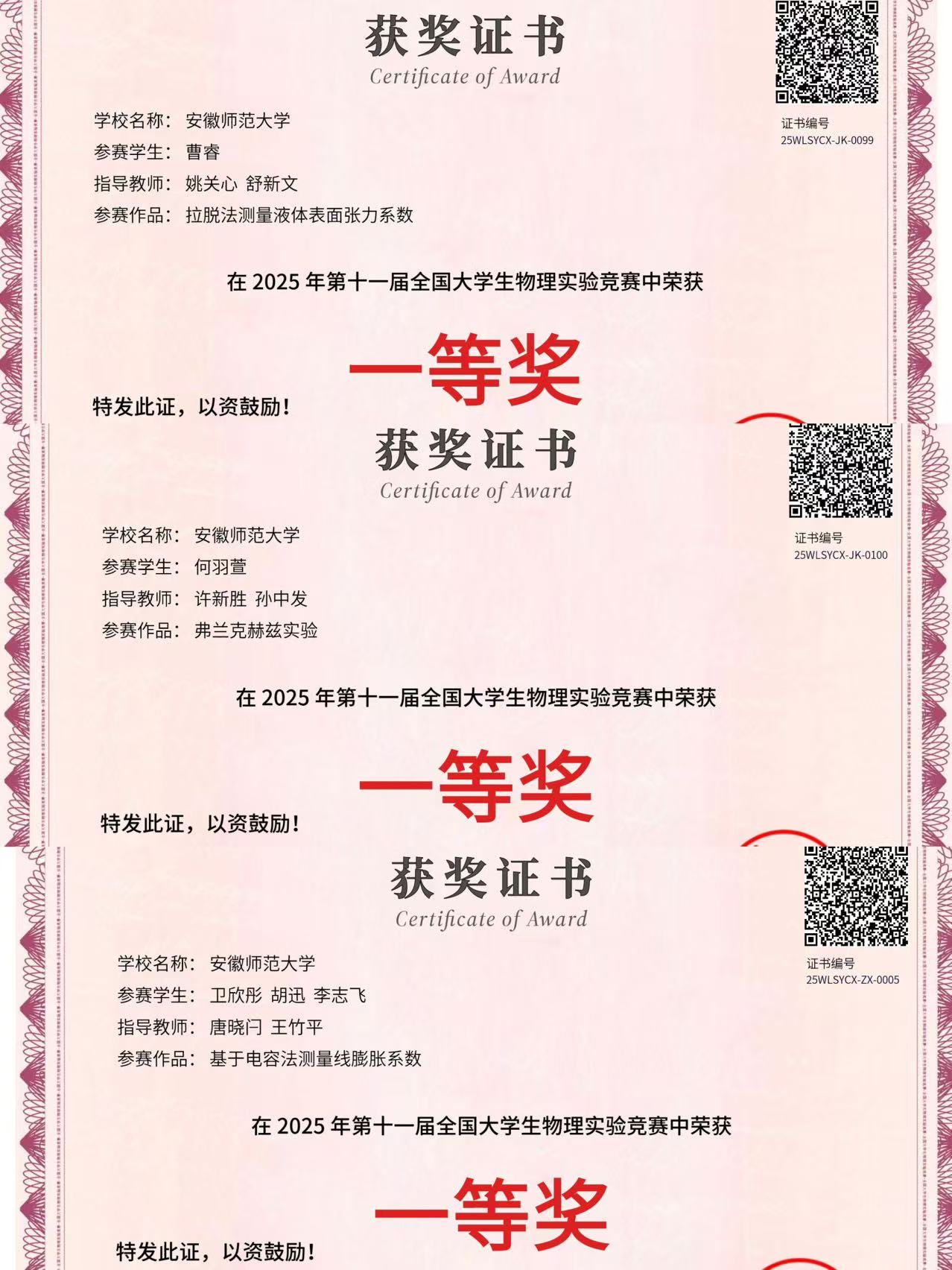 学校对本次赛事予以高度重视,自备赛活动启动以来,本科生院等相关部门给予全方位指导和支持,物电学院精心组织多轮集训,参赛团队师生全力打磨作品。经过校赛初审、国赛线上评审等环节的重重考验,最终,讲课类项目《拉脱法测量液体表面张力系数》《弗兰克赫兹实验》和自选类《基于电容法测量线膨胀系数》三个项目荣获全国一等奖。此外,命题类《光影密码:X射线如何“看见”晶体里的原子?》《基于U-Net模型的双光栅Lau效应波长测量系统》两个项目获得全国二等奖。