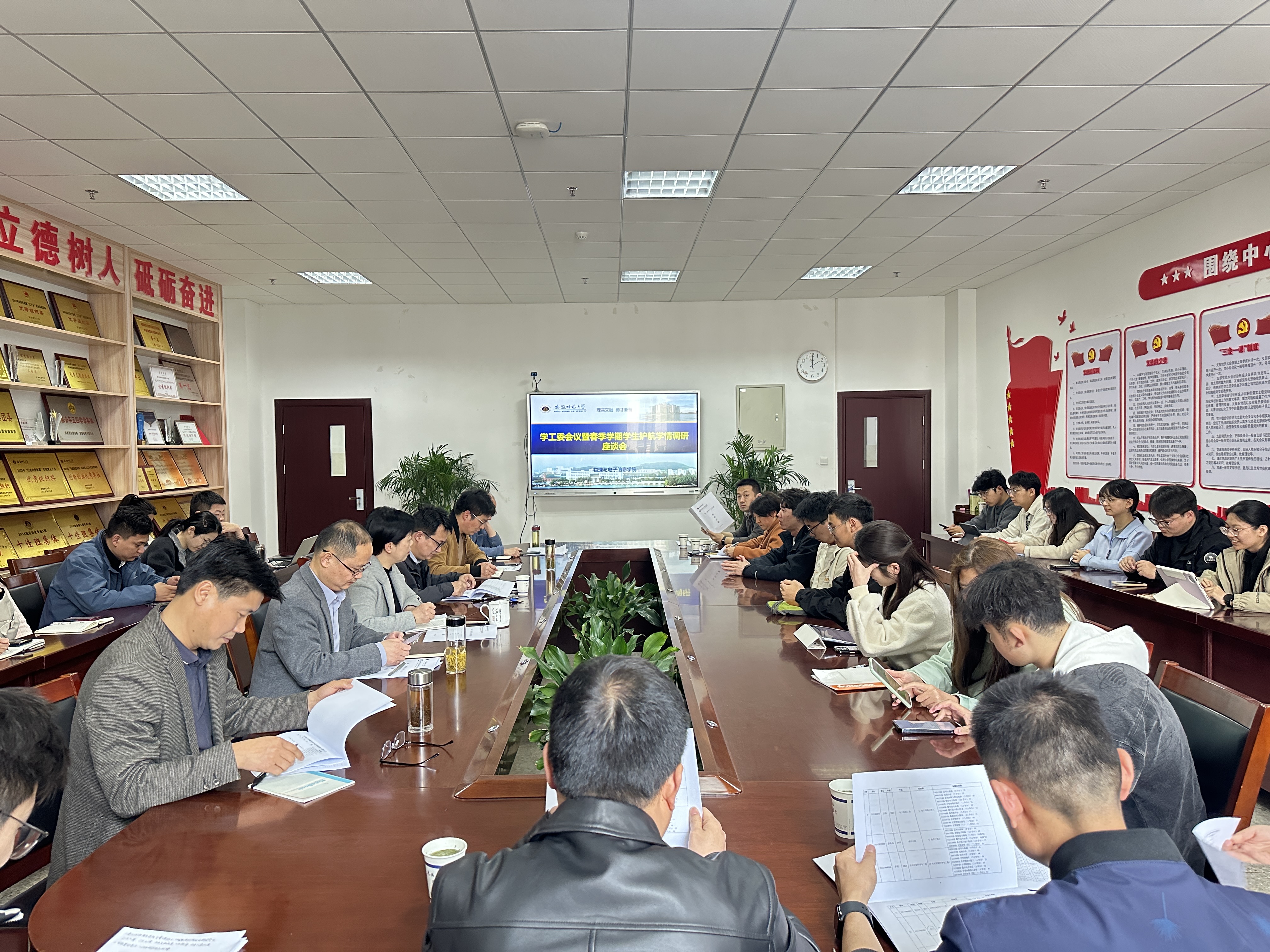 为扎实推进新时代立德树人工程,落实“健康第一”教育理念,做好学生教育管理和服务工作,4月1日下午,物电学院召开2026年春季学期学生护航学情调研座谈会暨学工委第二次会议,学院领导班子成员、专业负责人、相关科室人员及全体专兼职辅导员,各年级各专业学生代表参加座谈会。会议由学院党委副书记凌从祥主持。