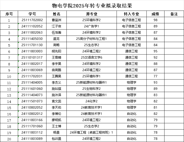 根据学校《关于做好2025年普通全日制本科生转专业工作的通知》(本科生院〔2025〕2号)文件精神,按照《安徽师范大学普通全日制本科生转专业管理办法》(校教字〔2022〕33号)相关要求以及《物理与电子信息学院2025年转专业工作实施细则》的要求,经笔试考查,现将2025年物理与电子信息学院转专业拟录取名单公示如下,公示期为2025年12月26日至12月30日,如有异议,请在公示期内向工作组反映,提倡实名反映问题。