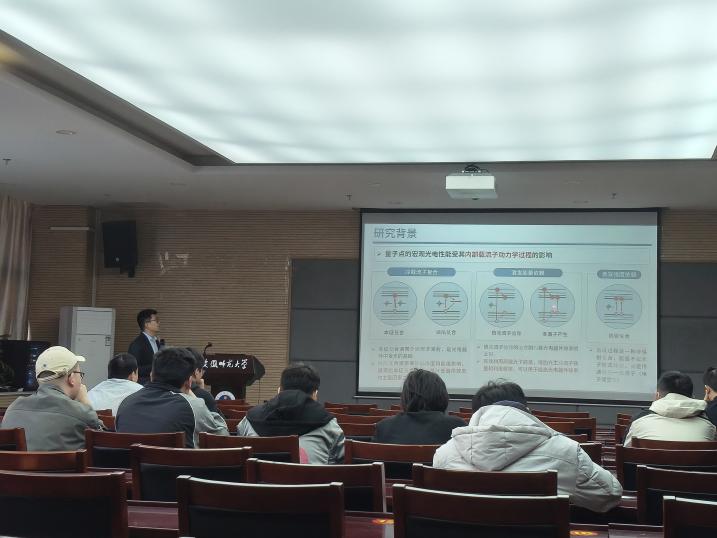 在报告中,孟杰系统阐述了量子点在发光二极管、太阳能电池等领域的巨大应用潜力,并指出了当前面临的主要障碍。其中,非辐射复合过程是制约量子点器件效率的关键因素。报告重点探讨了由缺陷介导的载流子俘获与高激发密度下的俄歇复合这两类过程,并介绍了如何利用超快光谱技术,深入研究量子点中“热载流子”的弛豫动力学。这项工作为突破Shockley-Queisser理论极限提供了新思路,同时结合合理的材料设计,从机理层面为优化载流子退激发路径、开发高性能量子点光电器件指明了方向。报告结束后,与会师生围绕相关议题与孟杰展开了深入交流与讨论。
