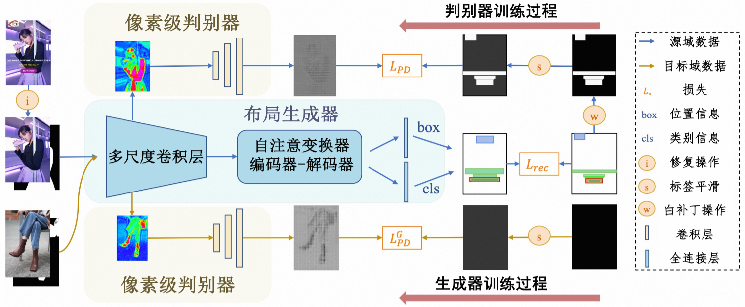 3. 针对广告海报传统自动化排版忽视图像内容的问题,构建大规模海报布局数据集并创新设计PDA-GAN模型,该模型通过像素级判别器消除域差异,可根据产品图像自动生成内容感知图形布局。实验证明该模型可达到最优性能,并已在阿里巴巴、淘宝、天猫、淘点点等平台应用。[IEEE TPAMI, vol.48, 2026]