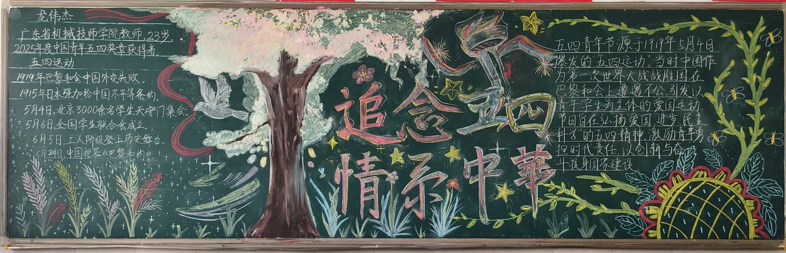 精思融创意,巧构展风华。各班级紧扣主题,精心创作。以五四精神为内核的黑板报,党旗飘扬、星芒点缀,以炽热的色彩铺陈出青年奋勇争先的精神图谱;回溯抗战岁月的板报,长城蜿蜒、战士坚毅,红灰交织的笔触勾勒出历史的厚重与和平的珍贵;聚焦科技报国的创作,飞机划破长空、火箭直上云霄,科技感线条与灵动配色碰撞,将物电学子的报国情怀诠释得淋漓尽致;而以自然为底色的板报,大树参天、花草摇曳,柔和的色调里流淌着对五四精神的深情追忆。每一幅作品都凝聚着同学们的奇思妙想,展现物电学子用专业视角解读时代命题,用青春笔触书写责任担当的卓越风采。