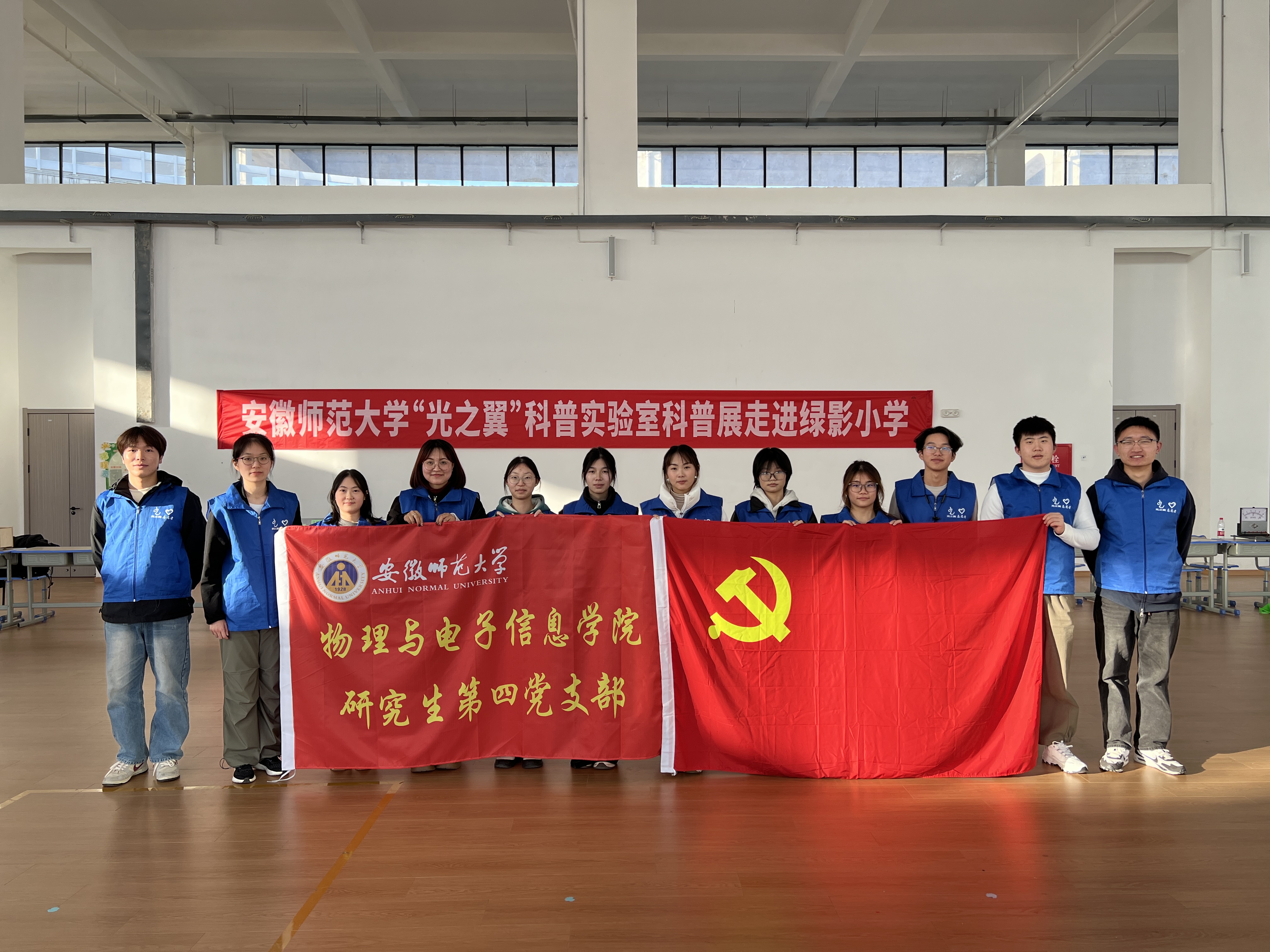 11月26日下午,安徽师范大学物理与电子信息学院研究生第四党支部联合“光之翼”科普志愿服务队志愿者,一同走进了镜湖区绿影小学,为三年级450余名小学生带来了一场别开生面的物理实验科普盛宴。本次活动旨在激发青少年对科学的兴趣,播撒科学创新的种子。