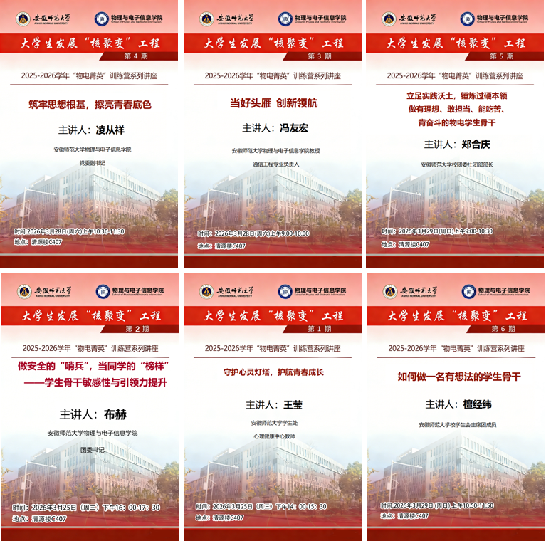 为进一步加强学生骨干队伍建设,提升学生骨干的综合素质与履职能力。3月25日至29日,物理与电子信息学院组织开展2025-2026学年“物电菁英”学生骨干培训班。学院团委、学生会、研究生会工作人员,各社团负责人,2024级、2025级各班班长、团支书、心理委员、寝室长等参加培训。