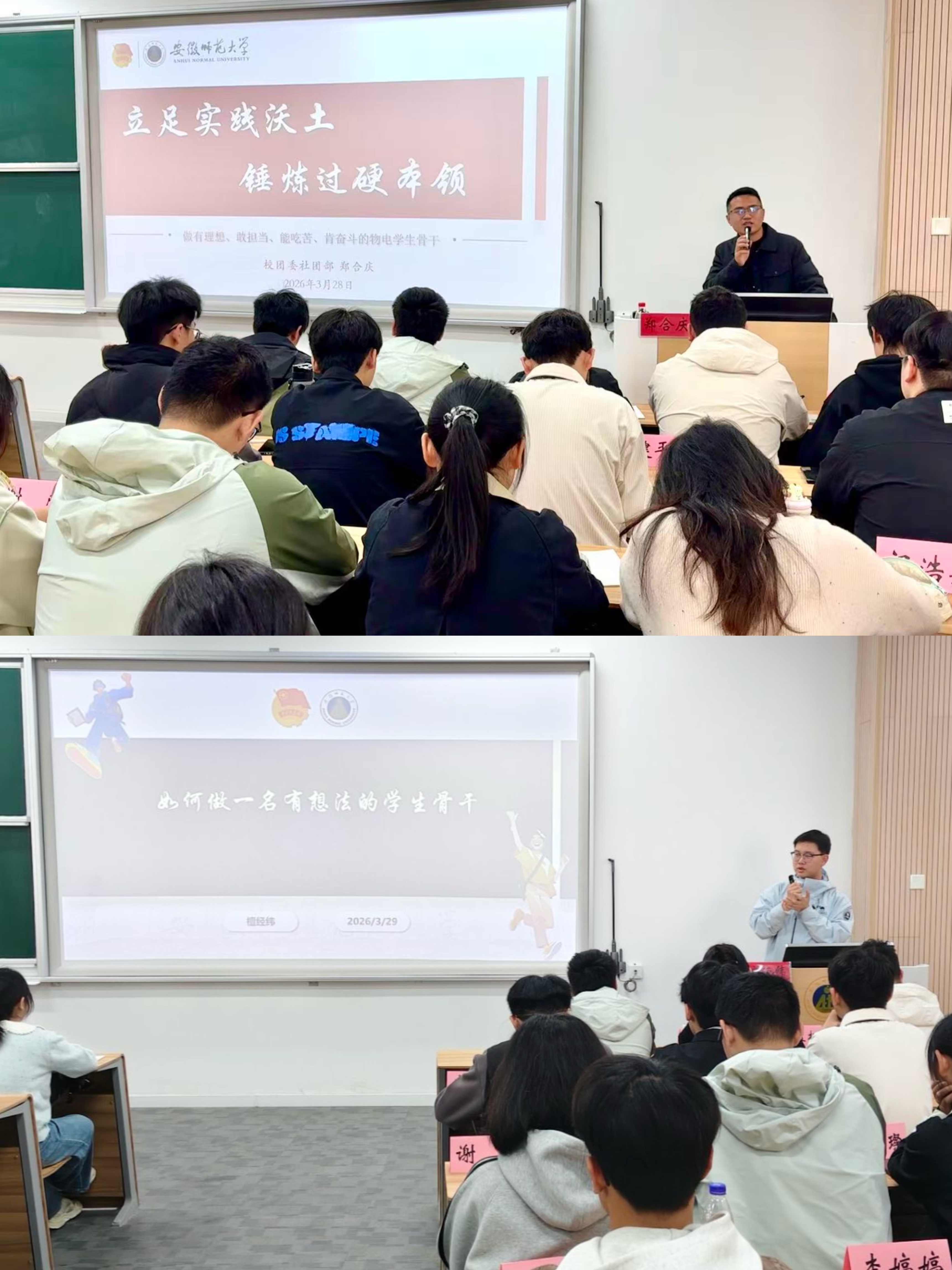 校团委社团部部长郑合庆以《立足实践沃土,锤炼过硬本领》为题,围绕学校社会实践大课堂,鼓励学员在实践中增长才干、砥砺品格。校学生会主席团成员檀经纬以《如何做一名有想法的学生骨干》为题,围绕学生骨干创新意识、工作方法与成长路径,与学员进行了深入交流。